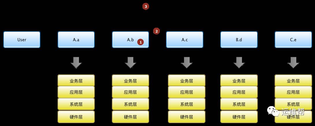 - 来自外部的对其产生的变更,如开发者对A.b服务进行了代码升级,该服务器所在交换机故障,局方机房网络割接