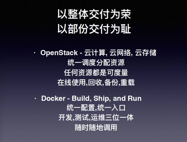 比如说OpenStack有模板,我打一个镜像包,稍微重了一点,Docker的就轻一点,Docker可以做一个滚动发布,可以保留原来的程序、原来的容器,你可以做快速切换,这也是一种变化的弹性。