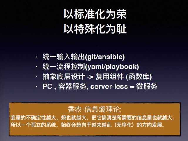 最后是巧妙的利用虚拟化、容器服务、server-less微服务,这些服务是可以被备份,还原的,可以保持一个相对稳定的状态,我们要拒绝多的特殊管理操作。