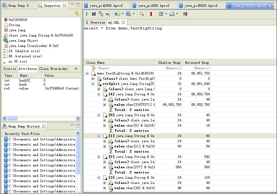 JDK6中分割的字符串数组中,每个String元素占用的内存都是原始字符串的内存大小(67M):