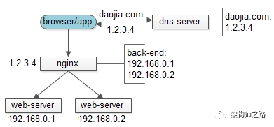 典型的互联网架构中,可以通过增加web-server来扩充web层的性能,但反向代理nginx仍是整个系统的唯一入口,如果系统吞吐超过nginx的性能极限,难以扩容,此时就需要dns-server来配合水平扩展。