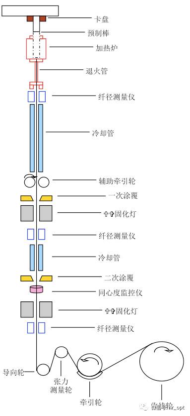 光纤拉丝塔内有一个石墨炉,可产生17000-2000度的高温,使预制棒软化,再由拉丝轮卷绕而拉成细长的光纤。拉丝塔有一个信息反馈系统,用来反馈炉温和绕速等,以通过激光测微计来精确控制光纤直径。