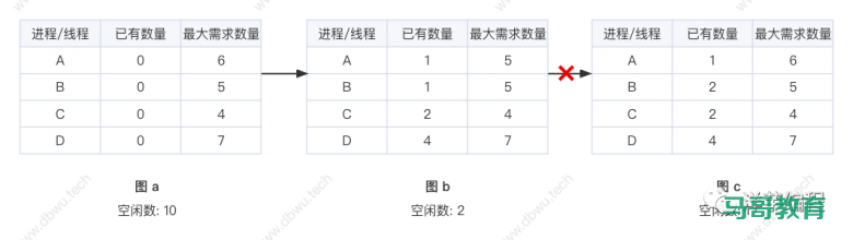 如图所示,每个表格第二列表示线程已拥有的资源数,第三列表示线程需要的所有资源数,“空闲数” 表示当前可以使用的资源数。