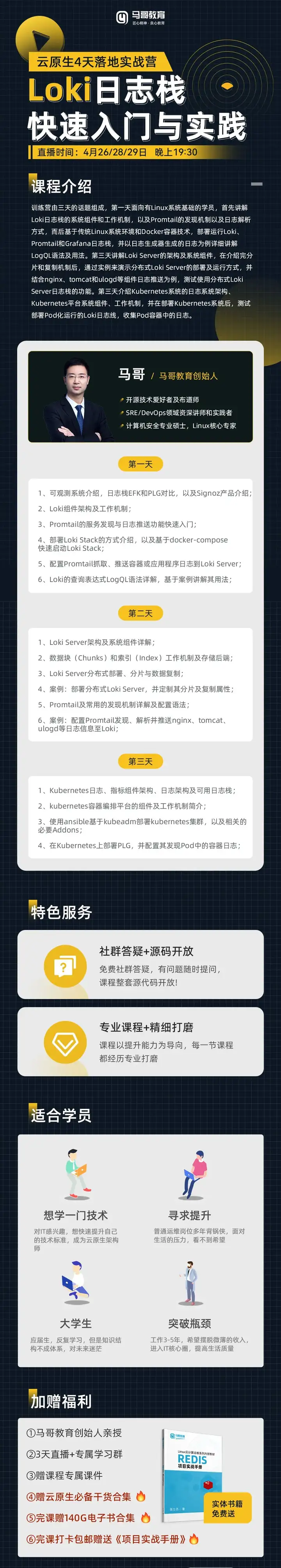 那么,应该怎么学习Loki呢?或许你可以把握这次【云原生落地实战营】。华为大佬鼎立推荐,马哥教育创始人—马哥亲授,在线教学!没有学不会,只有学不够!