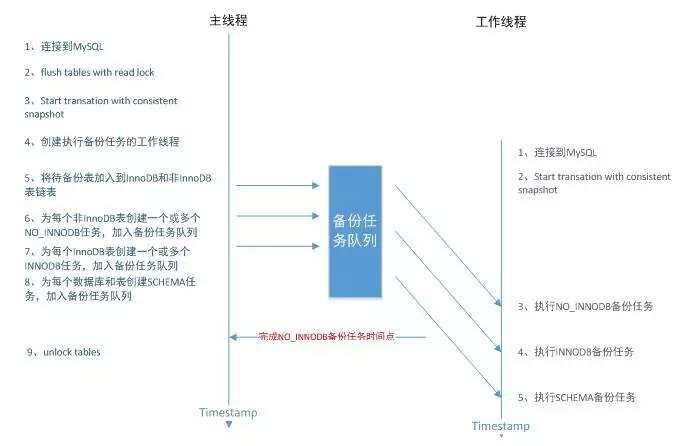 也许你会好奇,mydumper是如何实现记录级的多线程一致性备份的,其备份流程图如下: